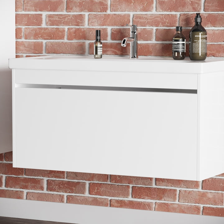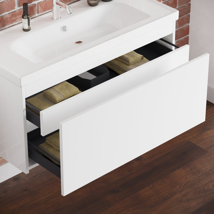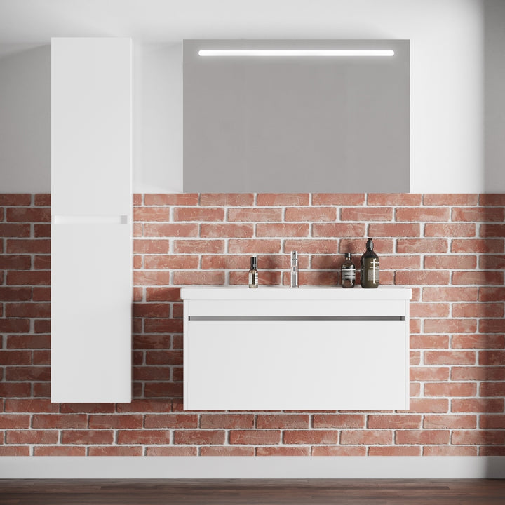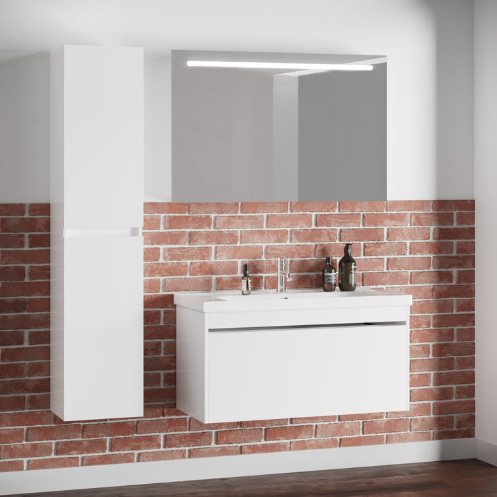 Amsterdam Badkamermeubel Set 100 cm Hoogglans Wit - Onderkast MDF Softclose Greeploos 2 lades met Keramische Wastafel 1 kraangat en Badkamerspiegel met Led-verlichting