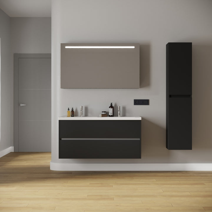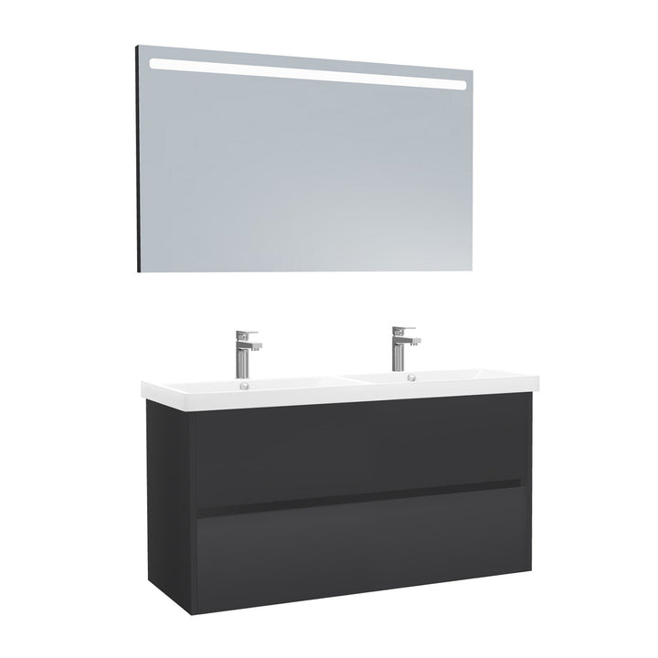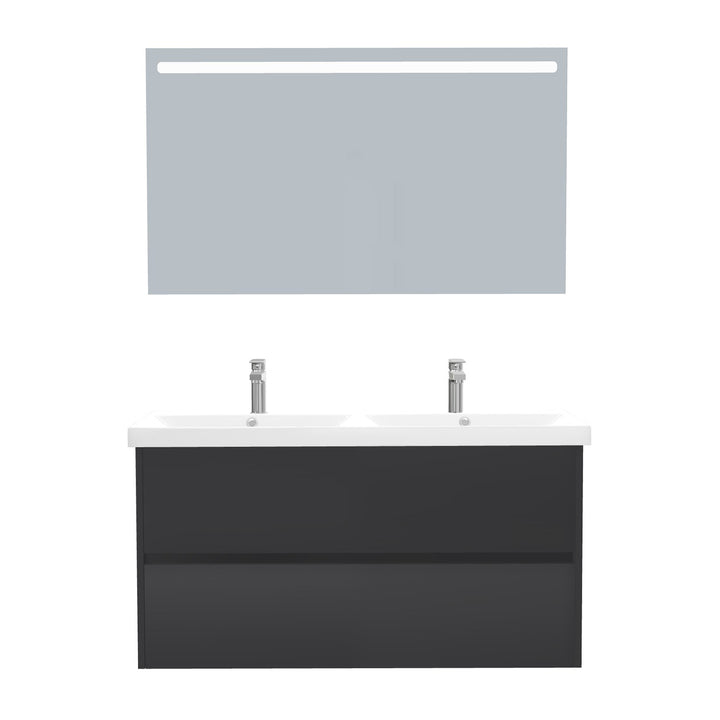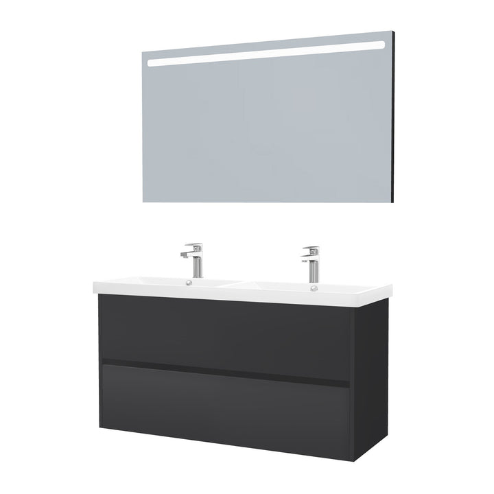Berlin Badkamermeubel Set 120 cm Mat Zwart - Onderkast MDF Softclose Greeploos 2 lades met Keramische Wastafel 2 kraangat en Badkamerspiegel met Led-verlichting