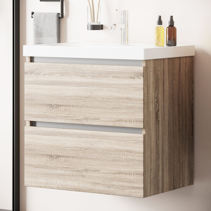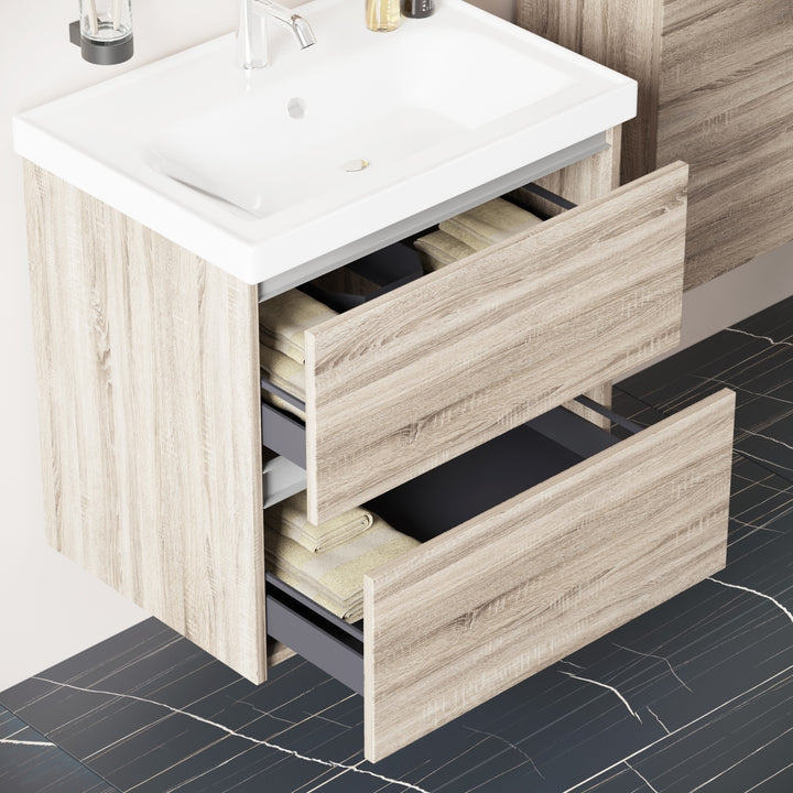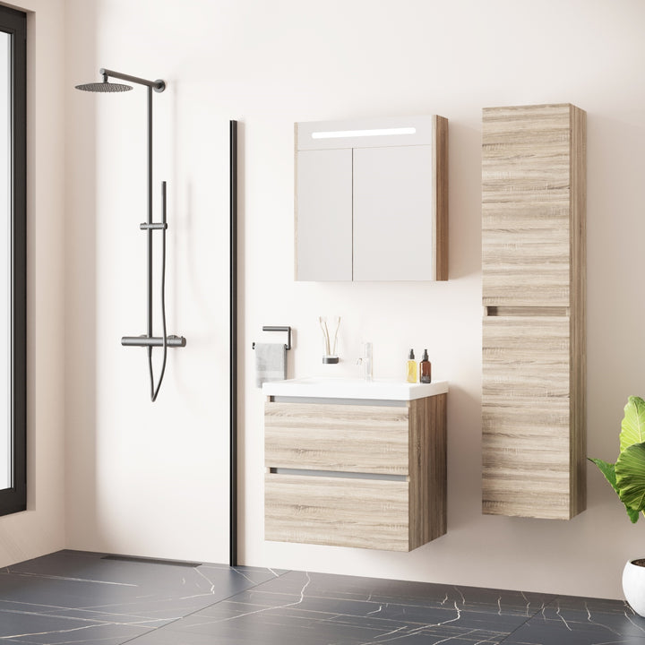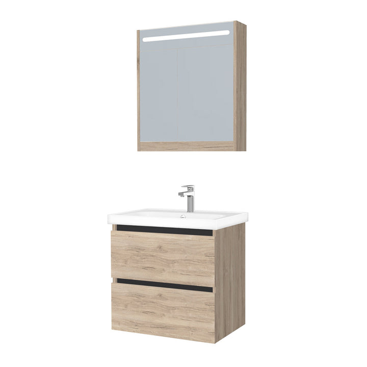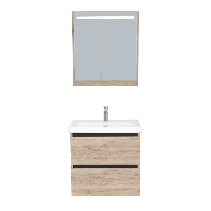 Bonn Badkamermeubel Set 65 cm Duitse Eik - Onderkast MDF Softclose Greeploos 2 lades met Keramische Wastafel 1 kraangat en Badkamerspiegelkast met Led-verlichting