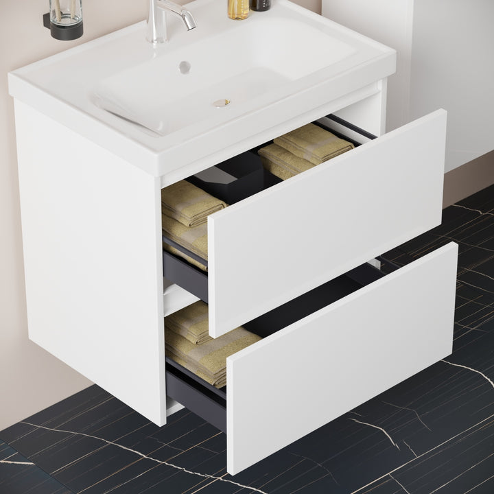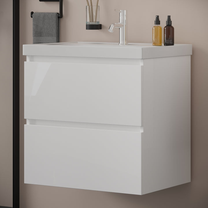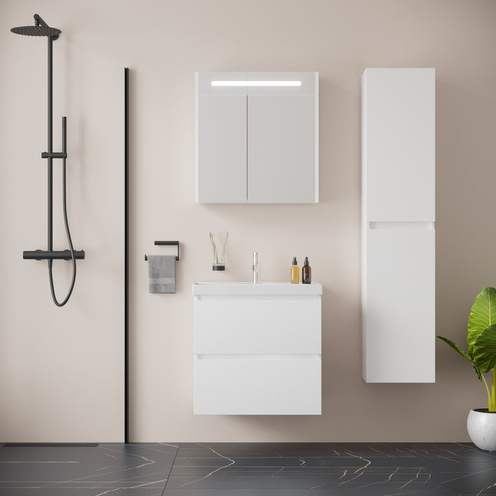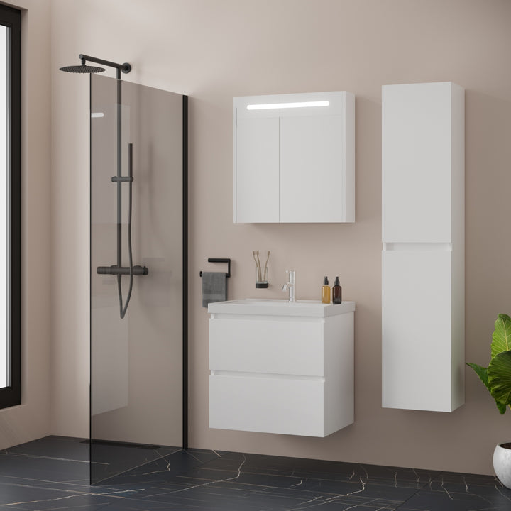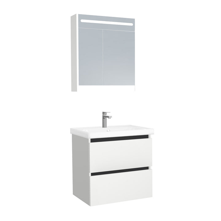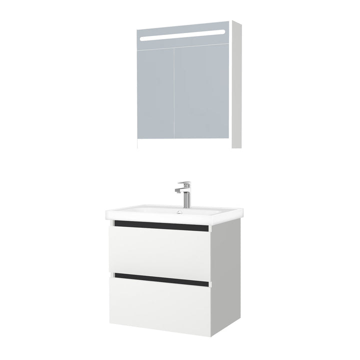 Bonn Badkamermeubel Set 65 cm Hoogglans Wit - Onderkast MDF Softclose Greeploos 2 lades met Keramische Wastafel 1 kraangat en Badkamerspiegelkast met Led-verlichting