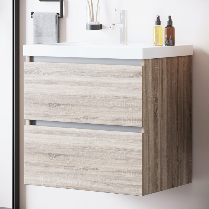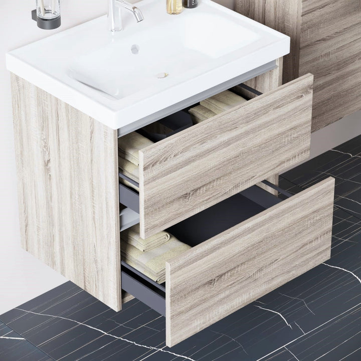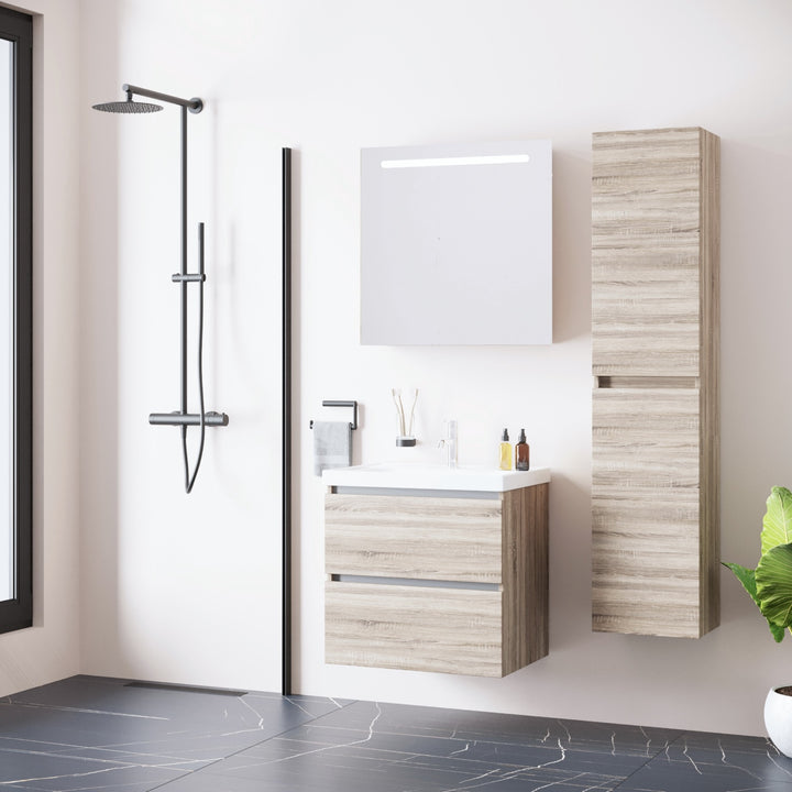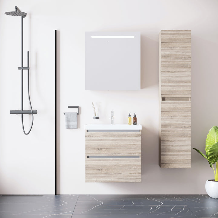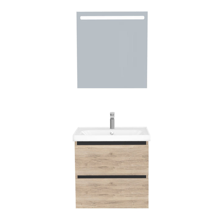 Bonn Badkamermeubel Set 65 cm Duitse Eik - Onderkast MDF Softclose Greeploos 2 lades met Keramische Wastafel 1 kraangat en Badkamerspiegel met Led-verlichting