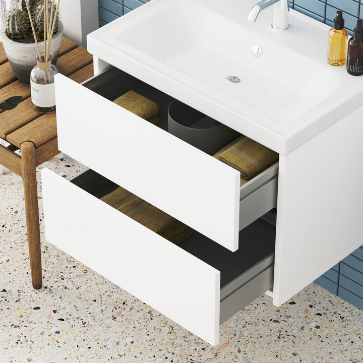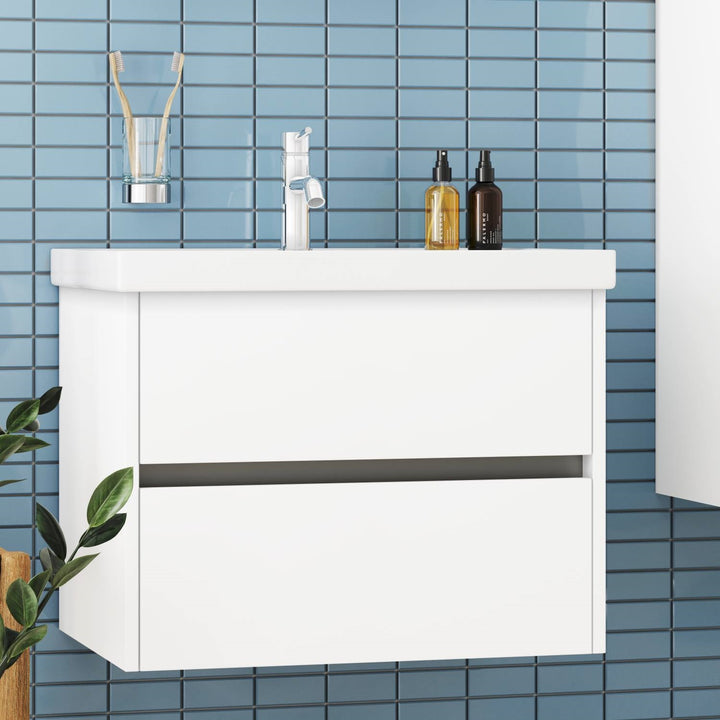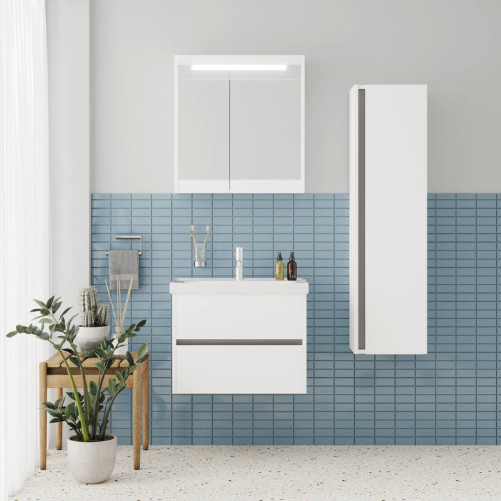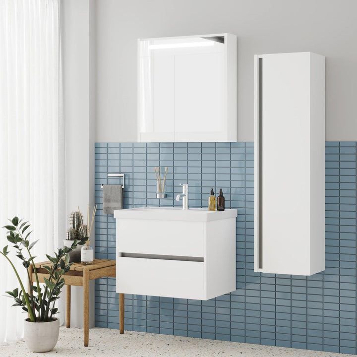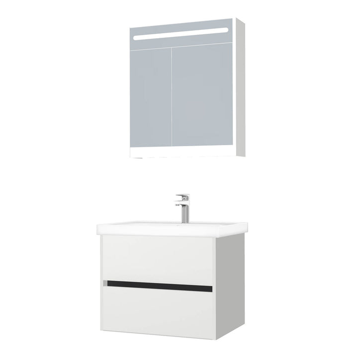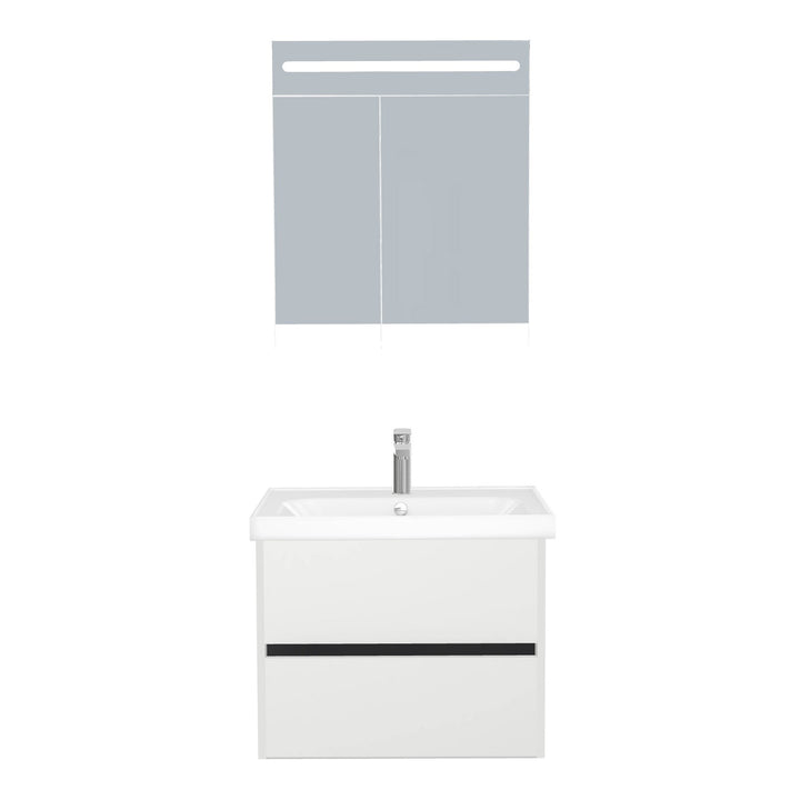 Jena Badkamermeubel Set 65 cm Hoogglans Wit - Onderkast MDF Softclose Greeploos 2 lades met Keramische Wastafel 1 kraangat en Badkamerspiegelkast met Led-verlichting