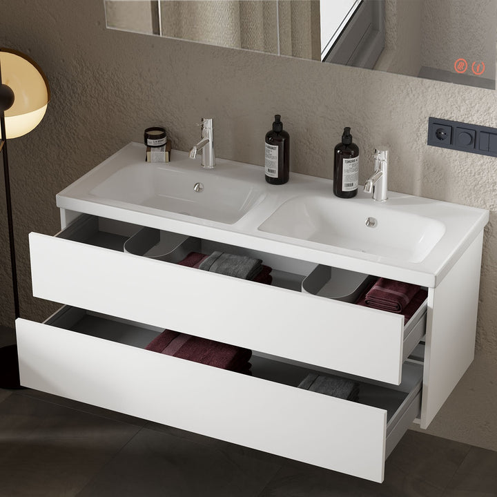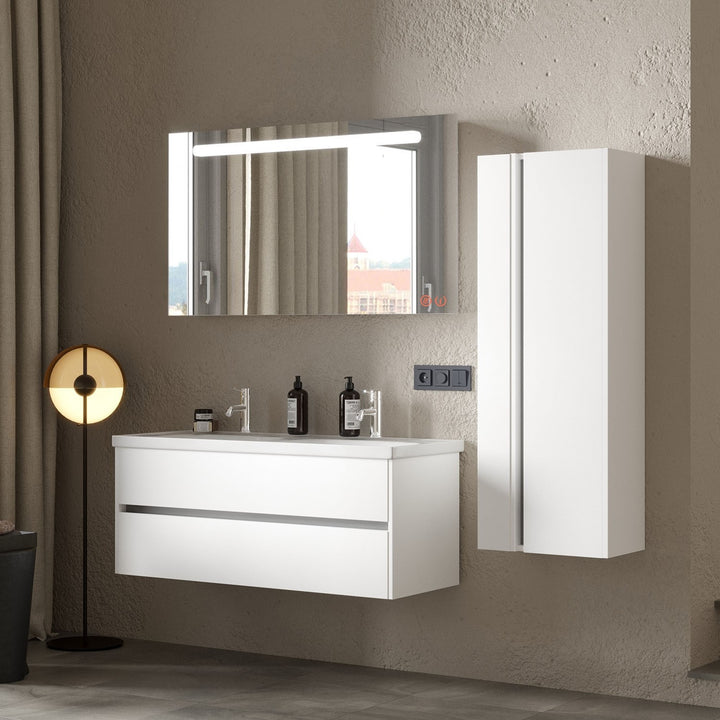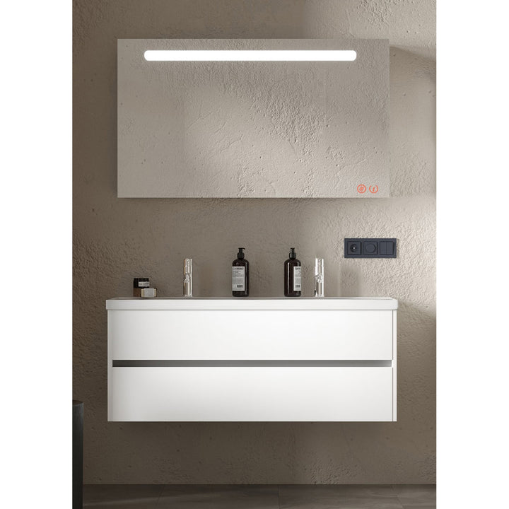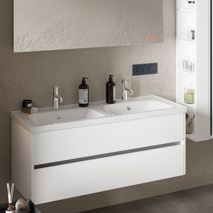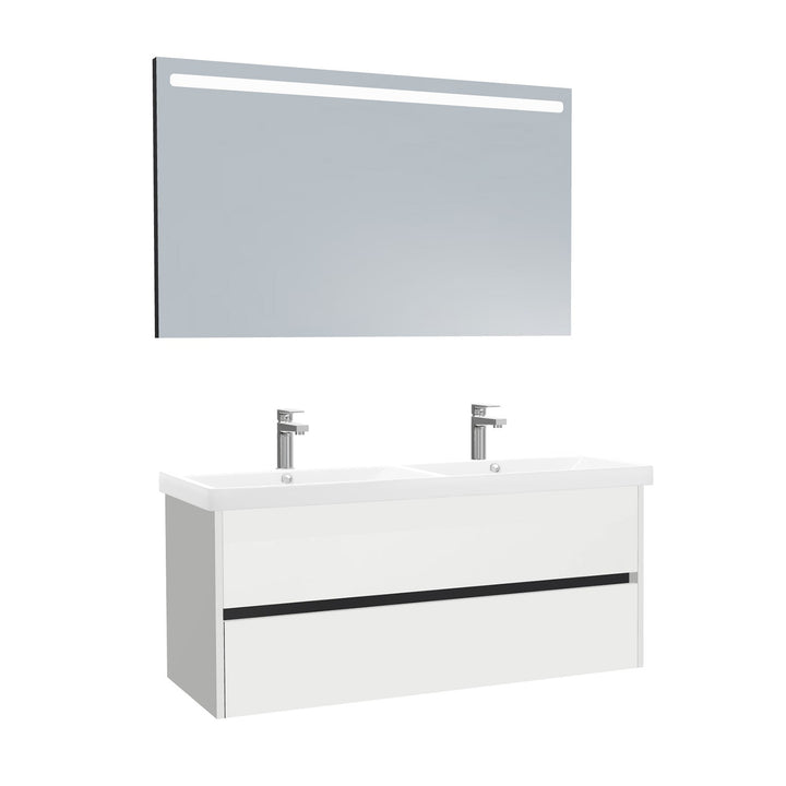 Jena Badkamermeubel Set 120 cm Hoogglans Wit - Onderkast MDF Softclose Greeploos 2 lades met Keramische Wastafel 2 kraangat en Badkamerspiegel met Led-verlichting