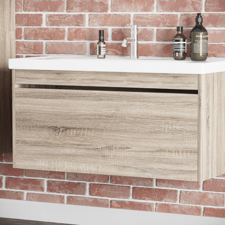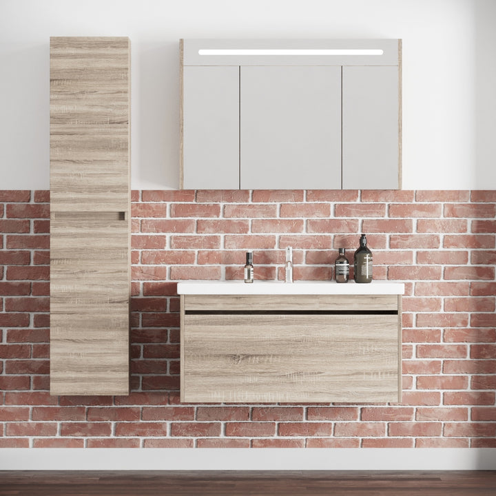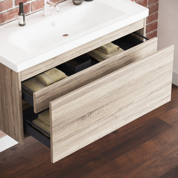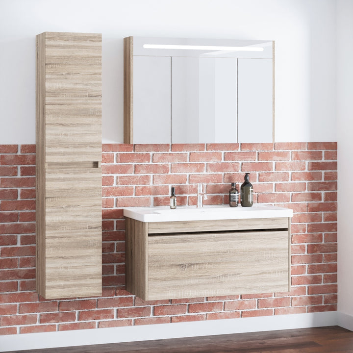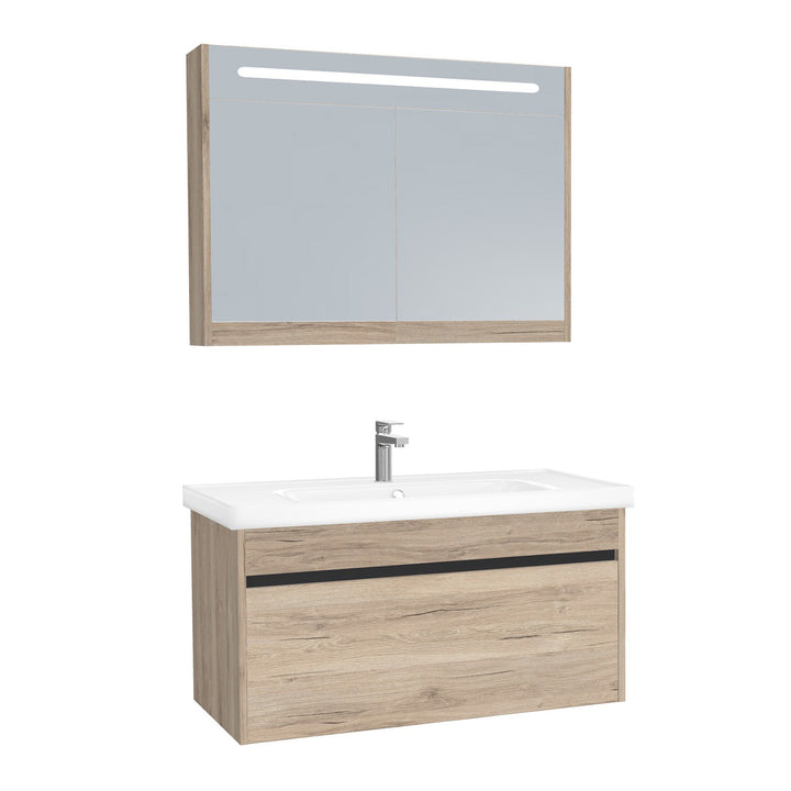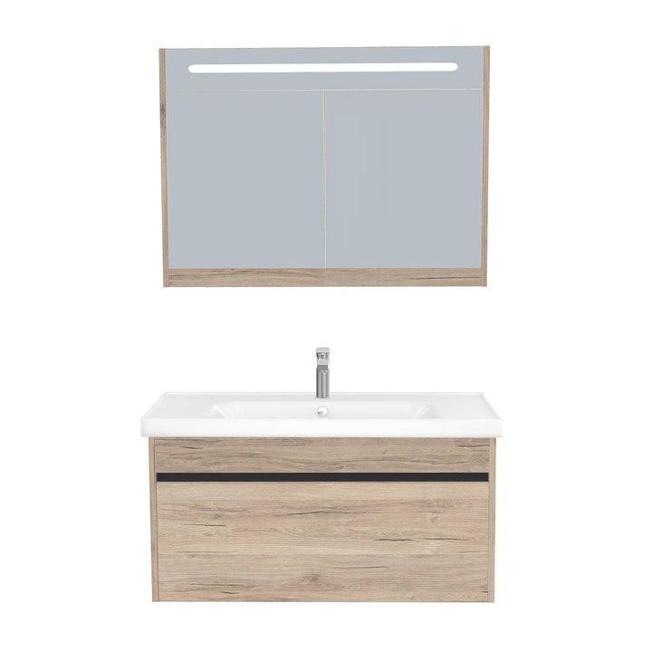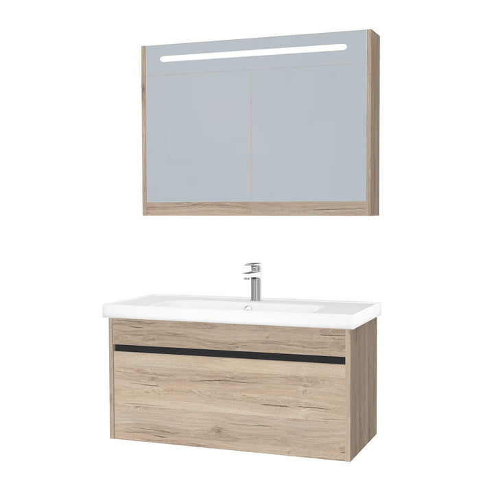 Amsterdam Badkamermeubel Set 100 cm Duitse Eik - Onderkast MDF Softclose Greeploos 2 lades met Keramische Wastafel 1 kraangat en Badkamerspiegelkast met Led-verlichting