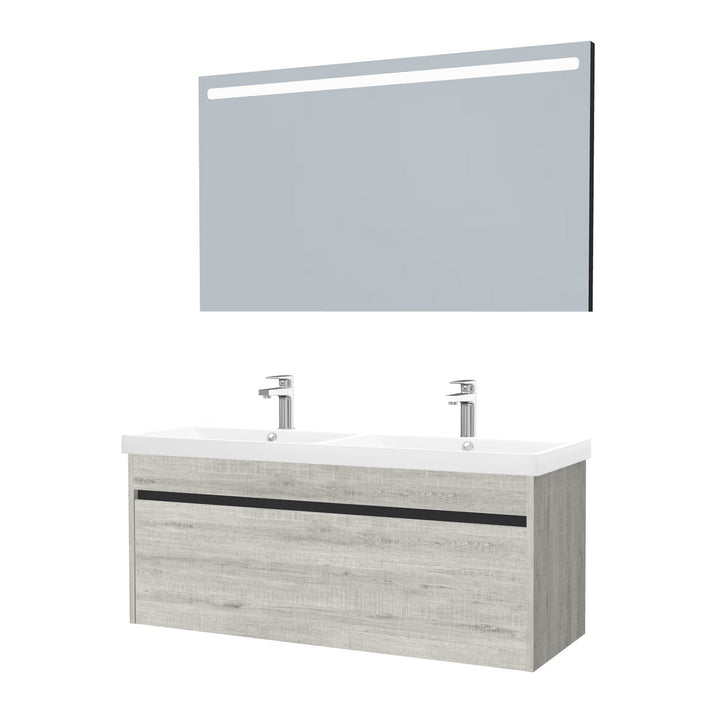 Amsterdam Badkamermeubel Set 120 cm Lissabon - Onderkast MDF Softclose Greeploos 2 lades met Keramische Wastafel 2 kraangat en Badkamerspiegel met Led-verlichting