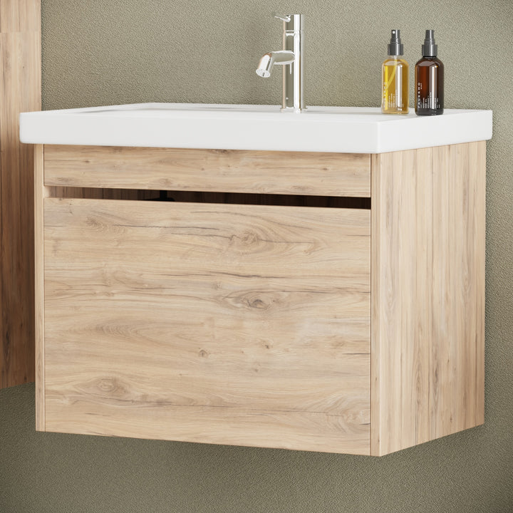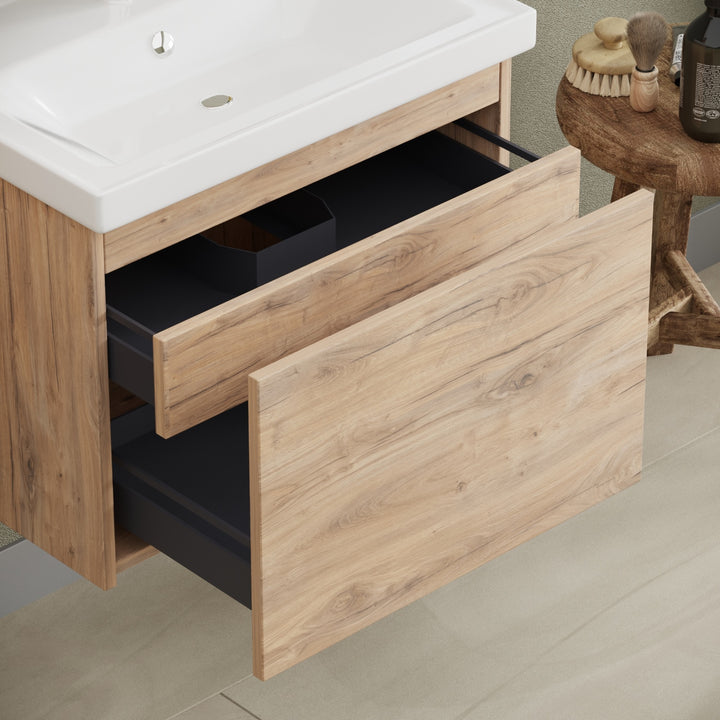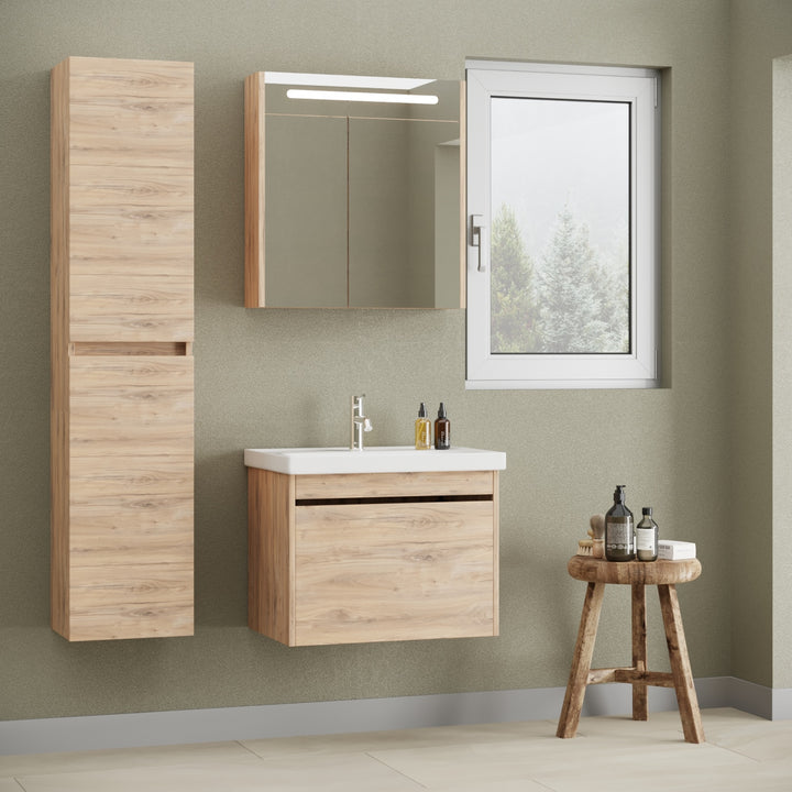 Amsterdam Badkamermeubel Set 65 cm Dorado - Onderkast MDF Softclose Greeploos 2 lades met Keramische Wastafel 1 kraangat en Badkamerspiegelkast met Led-verlichting