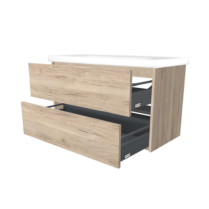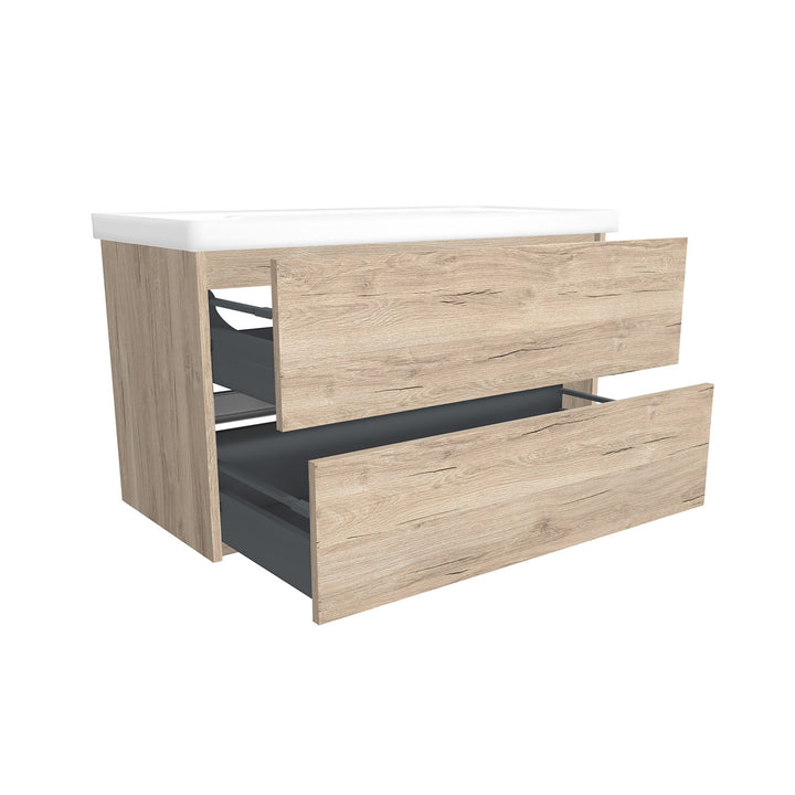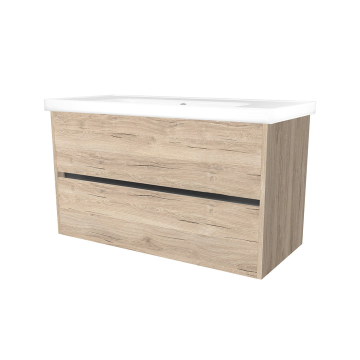 Berlin 100 cm Duitse Eik - Onderkast MDF Softclose Greeploos 2 lades met Keramische Wastafel 1 kraangat - Wastafelmeubel Met Frame Wastafels