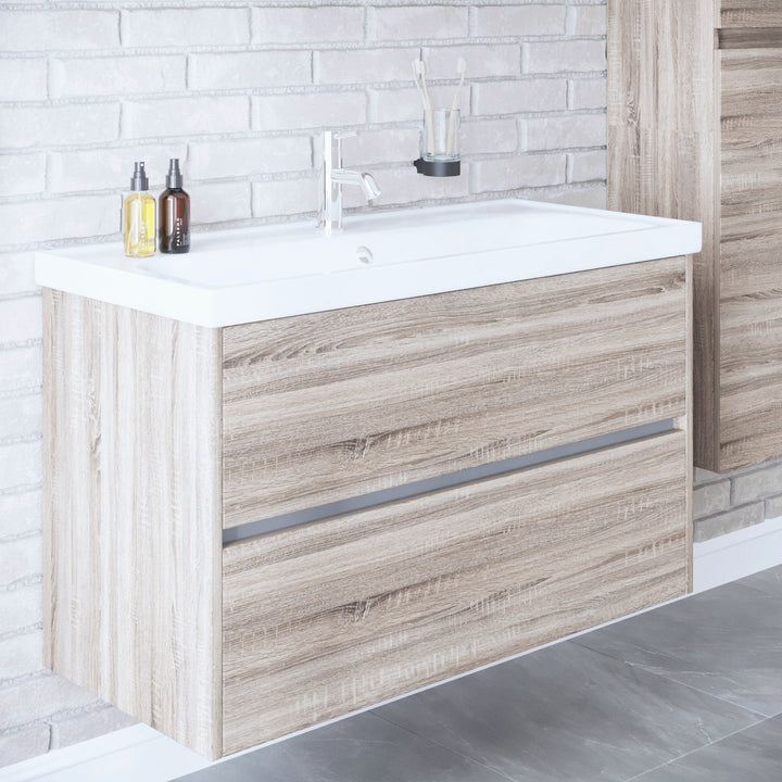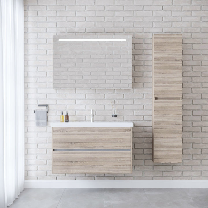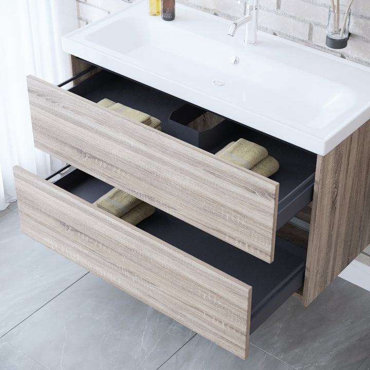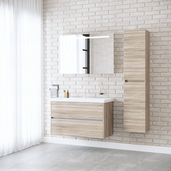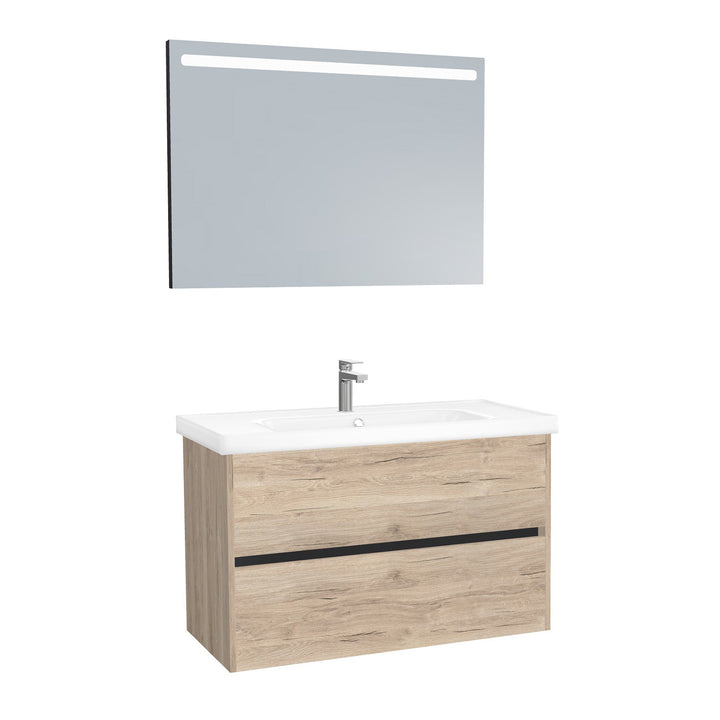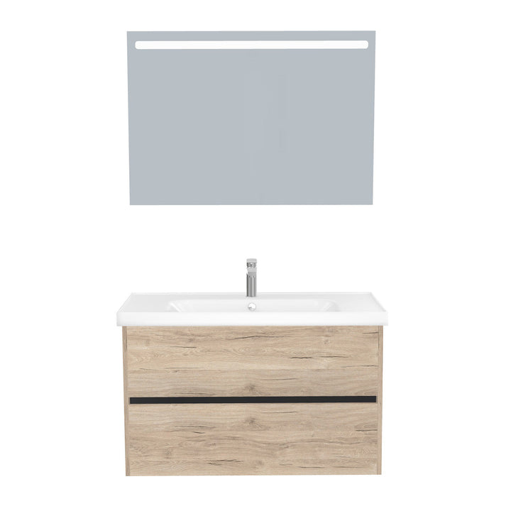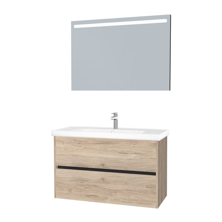 Berlin Badkamermeubel Set 100 cm Duitse Eik - Onderkast MDF Softclose Greeploos 2 lades met Keramische Wastafel 1 kraangat en Badkamerspiegel met Led-verlichting