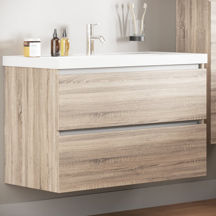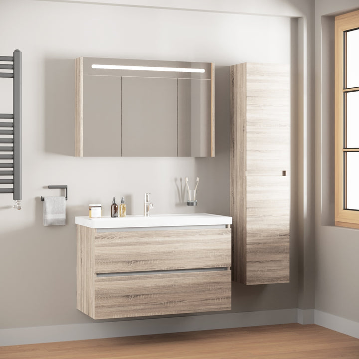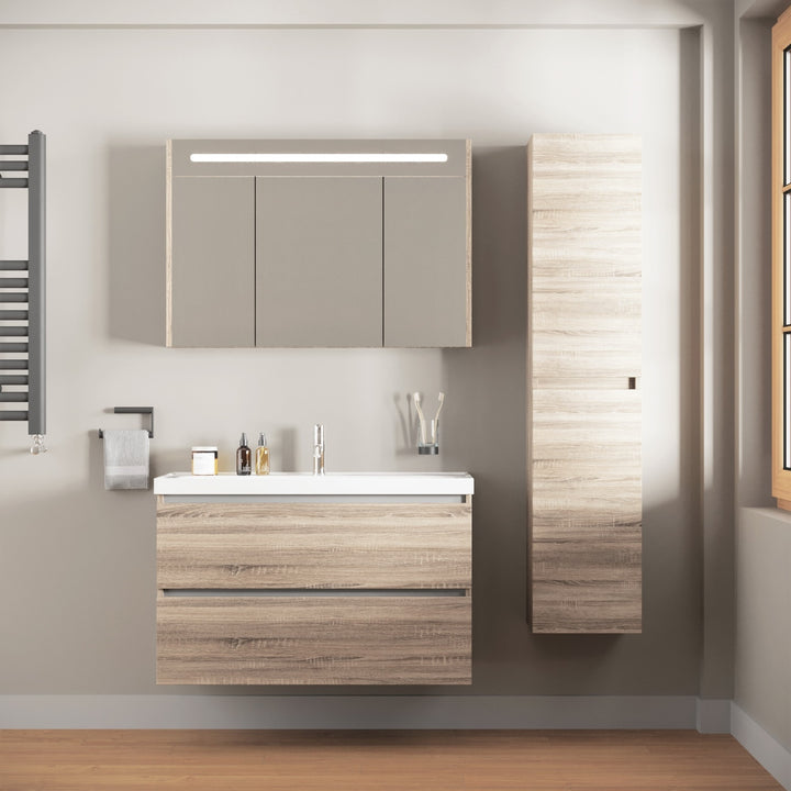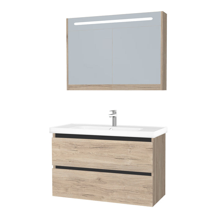 Bonn Badkamermeubel Set 100 cm Duitse Eik - Onderkast MDF Softclose Greeploos 2 lades met Keramische Wastafel 1 kraangat en Badkamerspiegelkast met Led-verlichting