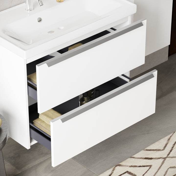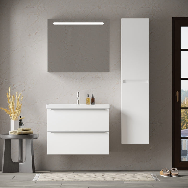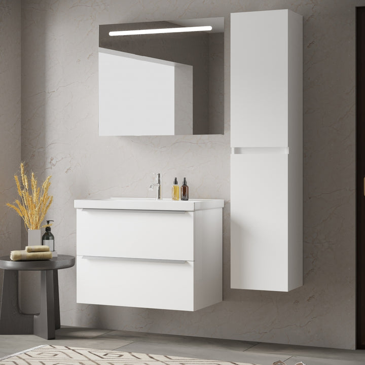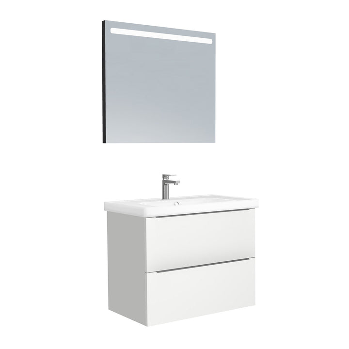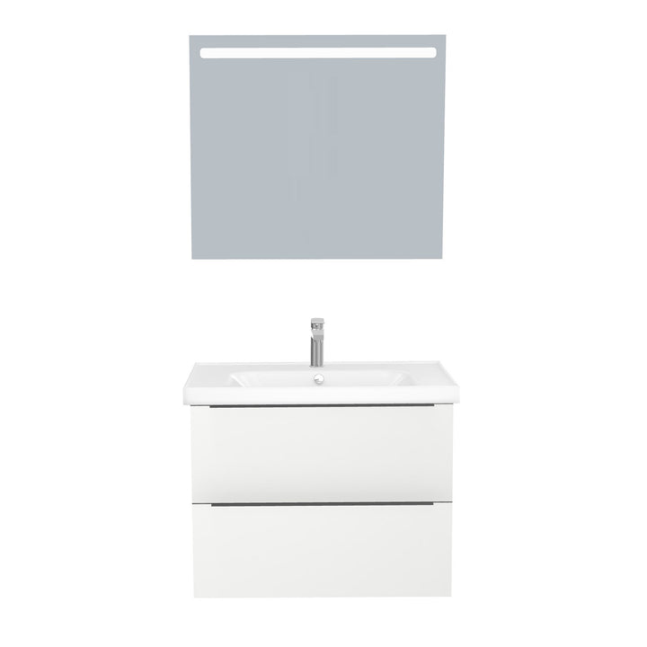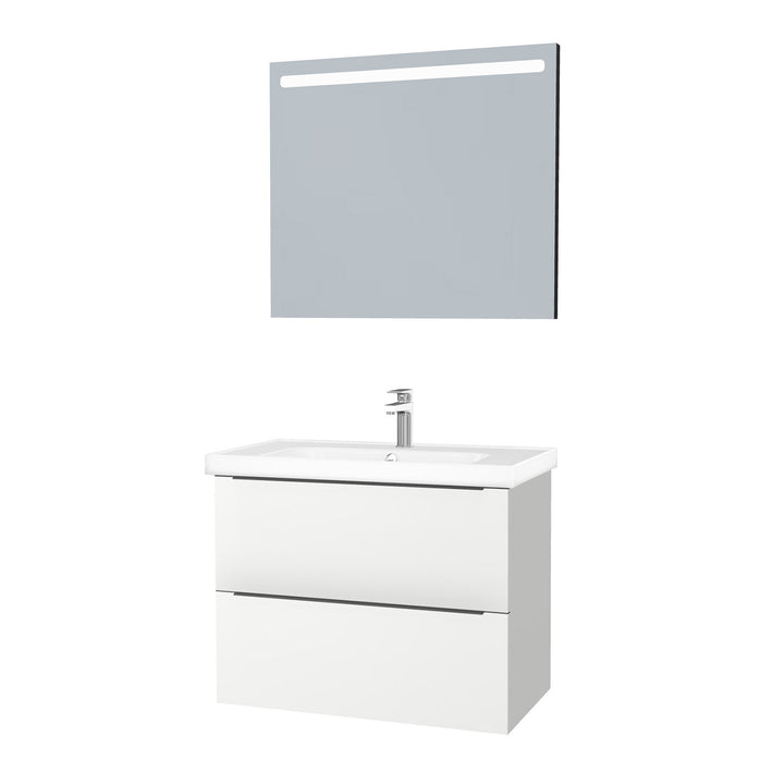 Frankfurt Badkamermeubel Set 80 cm Hoogglans Wit - Onderkast MDF Softclose Semi handgreep 2 lades met Keramische Wastafel 1 kraangat en Badkamerspiegel met Led-verlichting