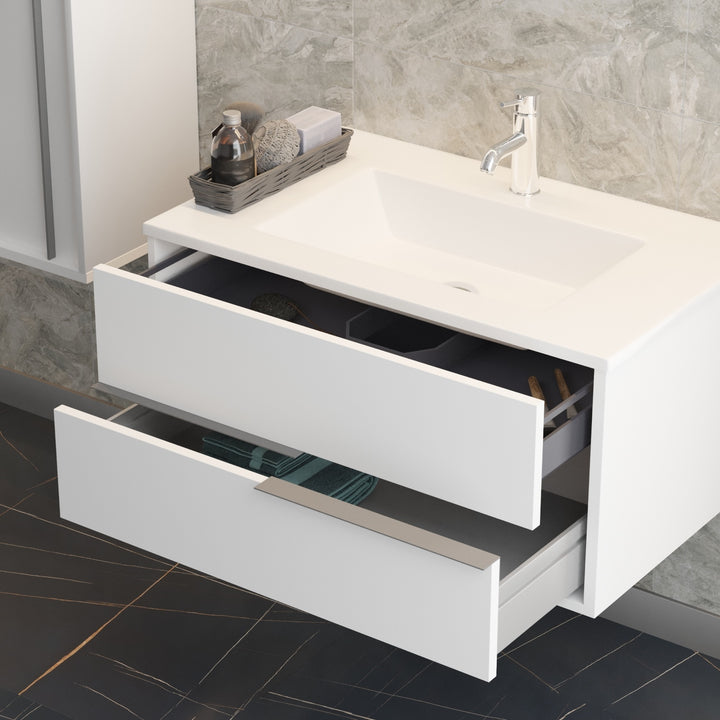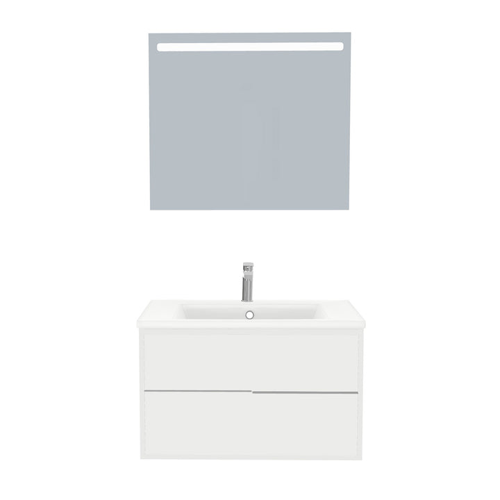 Essen Badkamermeubel Set 80 cm Hoogglans Wit - Onderkast MDF Softclose Semi handgreep 2 lades met Keramische Wastafel 1 kraangat en Badkamerspiegel met Led-verlichting