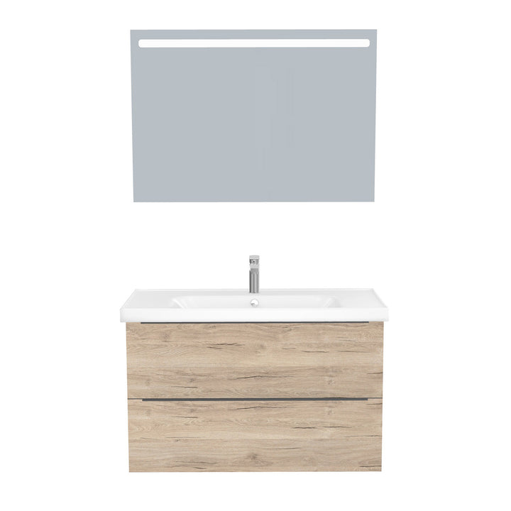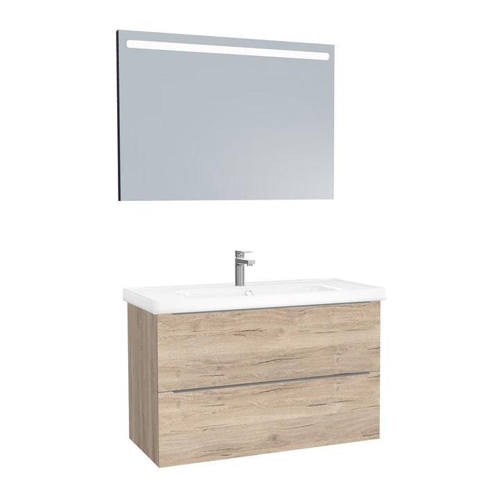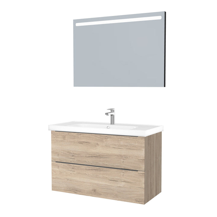 Frankfurt Badkamermeubel Set 100 cm Duitse Eik - Onderkast MDF Softclose Semi handgreep 2 lades met Keramische Wastafel 1 kraangat en Badkamerspiegel met Led-verlichting