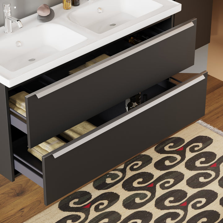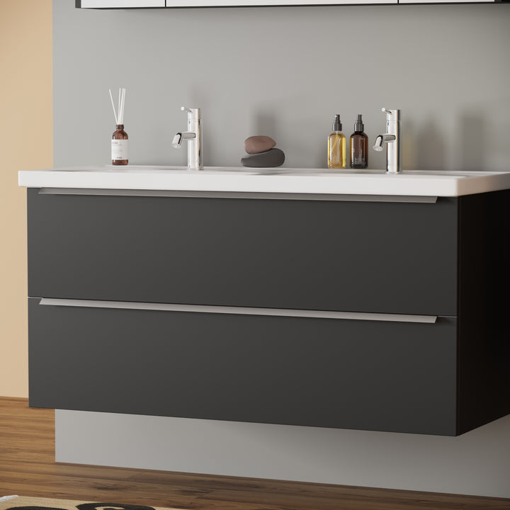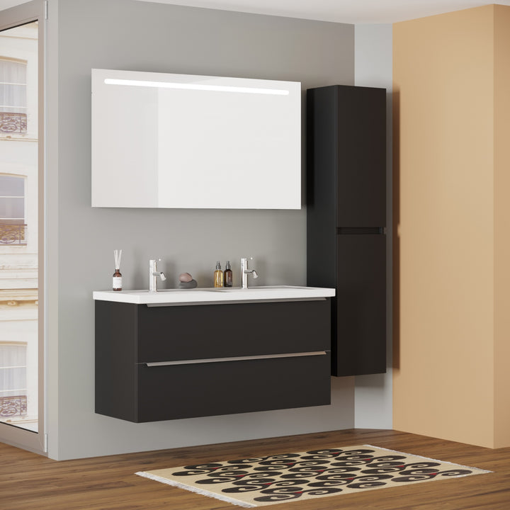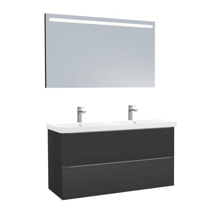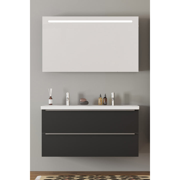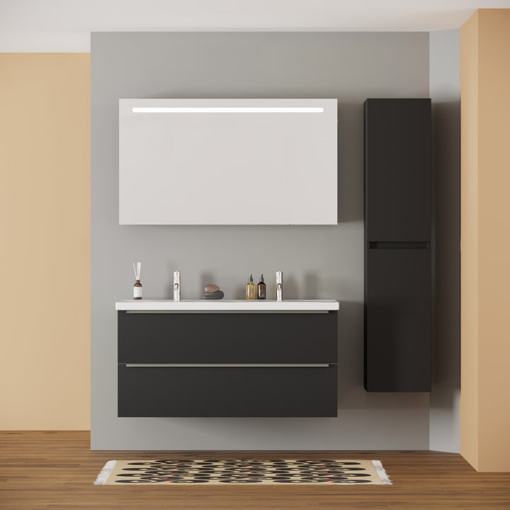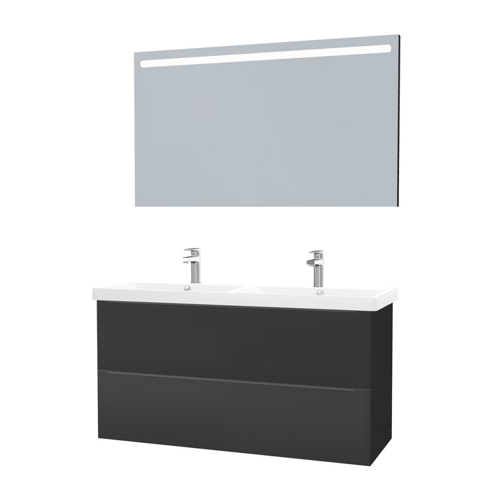 Frankfurt Badkamermeubel Set 120 cm Mat Zwart - Onderkast MDF Softclose Semi handgreep 2 lades met Keramische Wastafel 2 kraangat en Badkamerspiegel met Led-verlichting