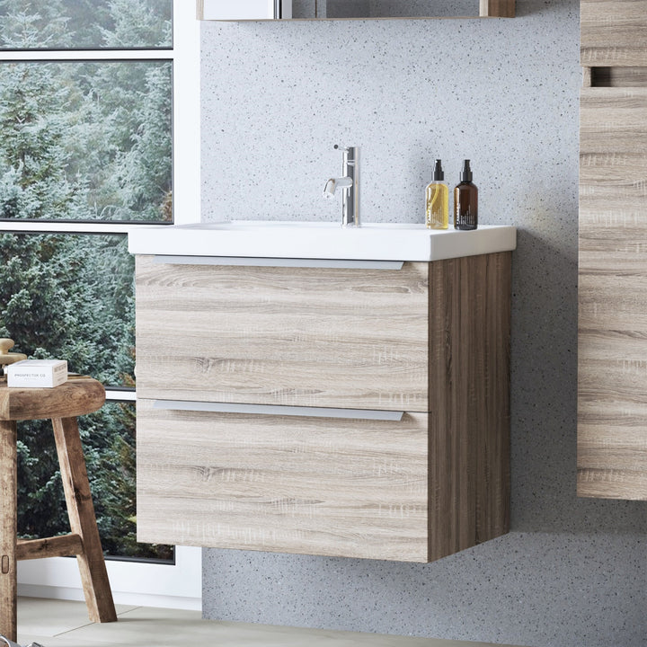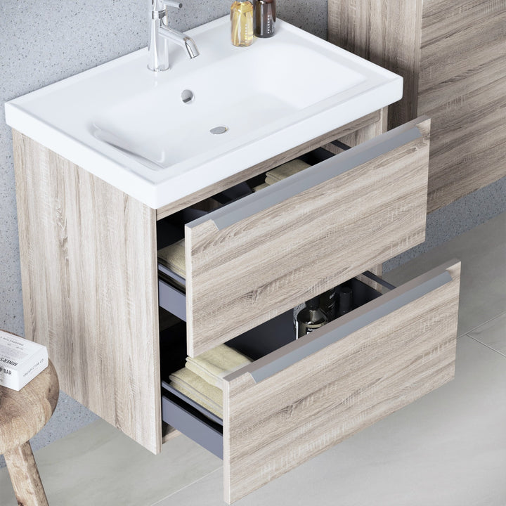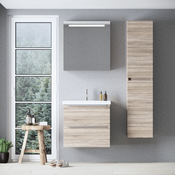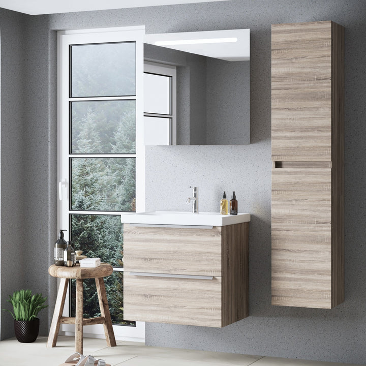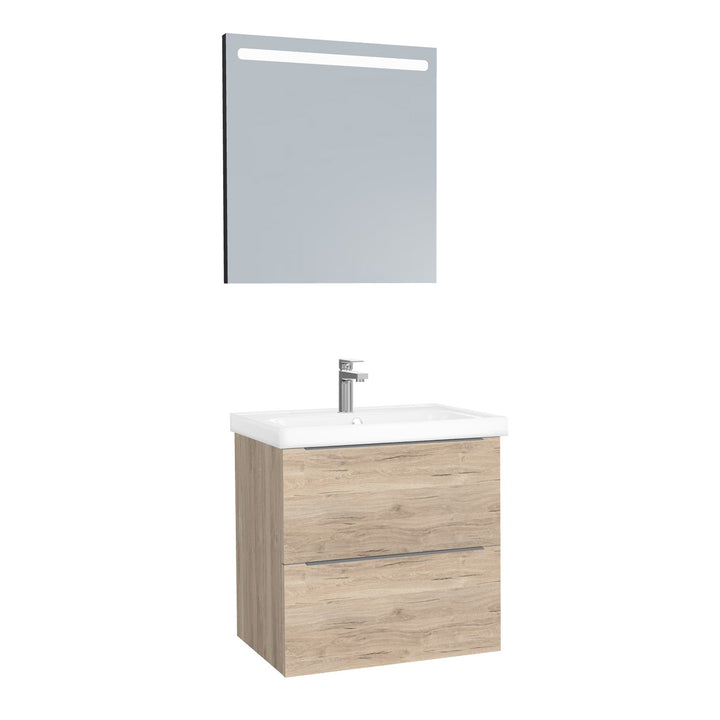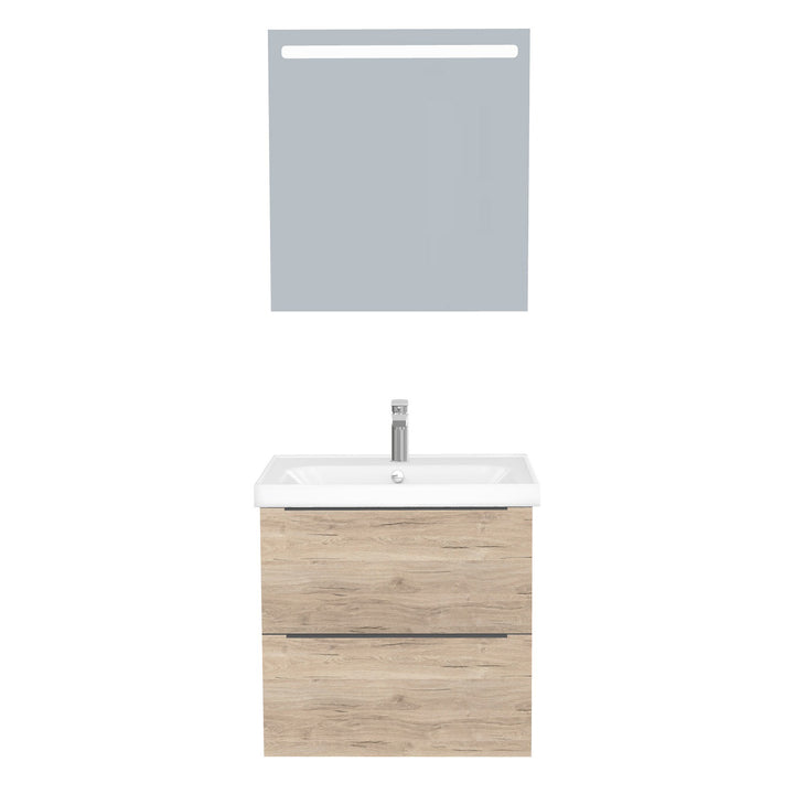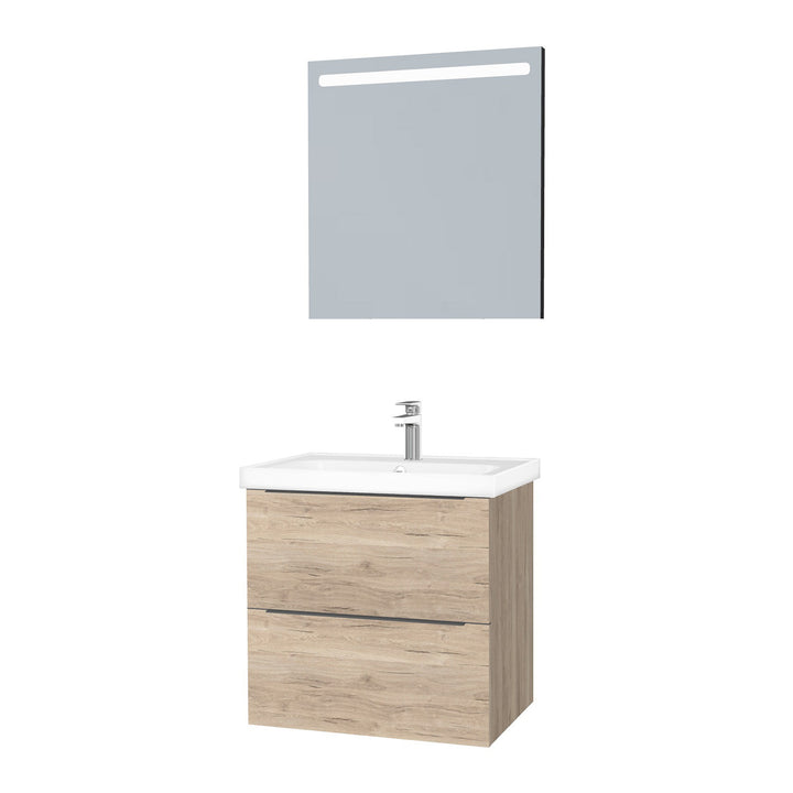 Frankfurt Badkamermeubel Set 65 cm Duitse Eik - Onderkast MDF Softclose Semi handgreep 2 lades met Keramische Wastafel 1 kraangat en Badkamerspiegel met Led-verlichting