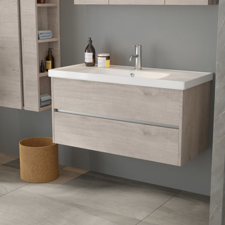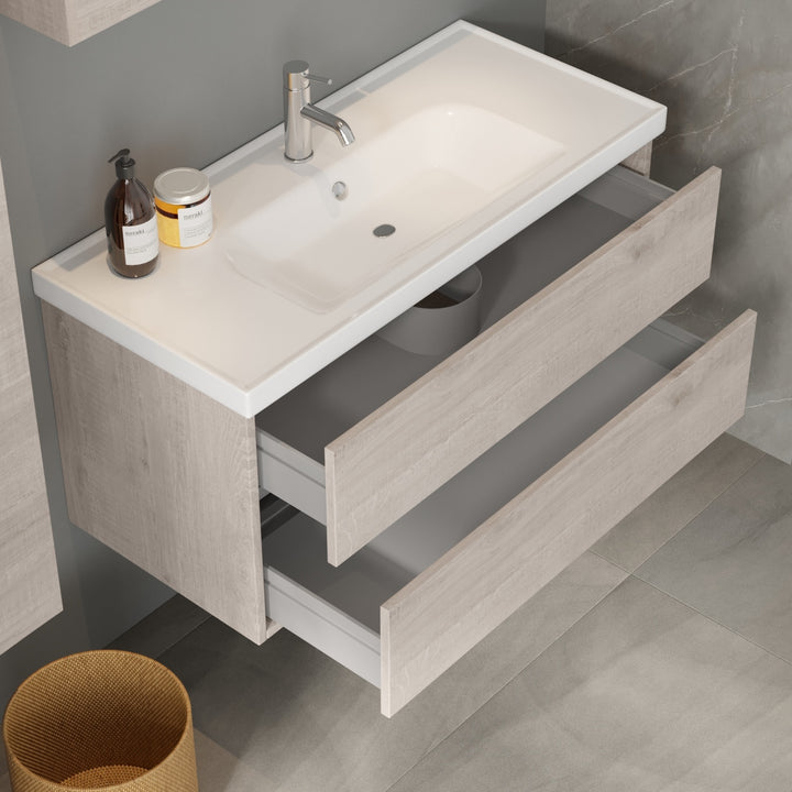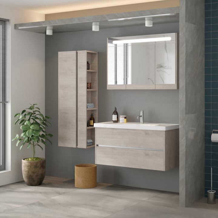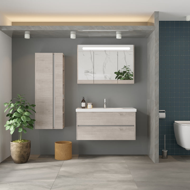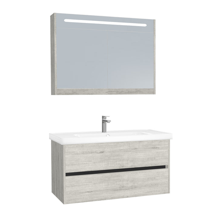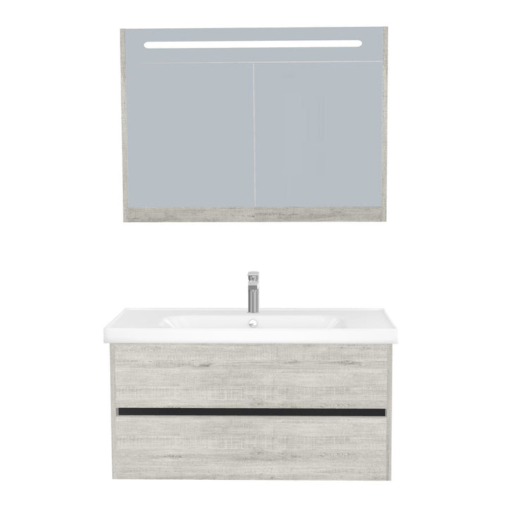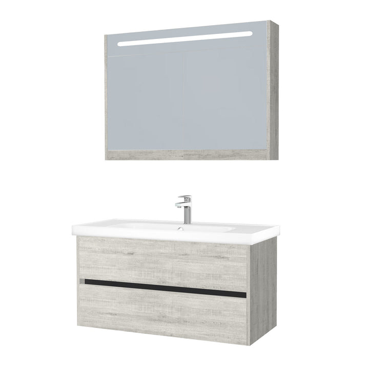 Jena Badkamermeubel Set 100 cm Lissabon - Onderkast MDF Softclose Greeploos 2 lades met Keramische Wastafel 1 kraangat en Badkamerspiegelkast met Led-verlichting