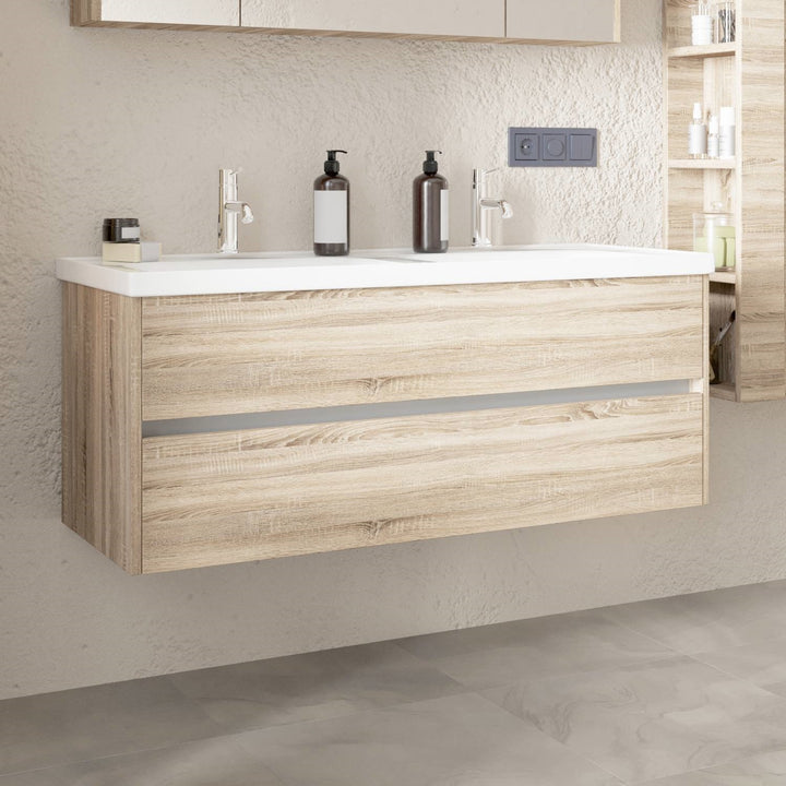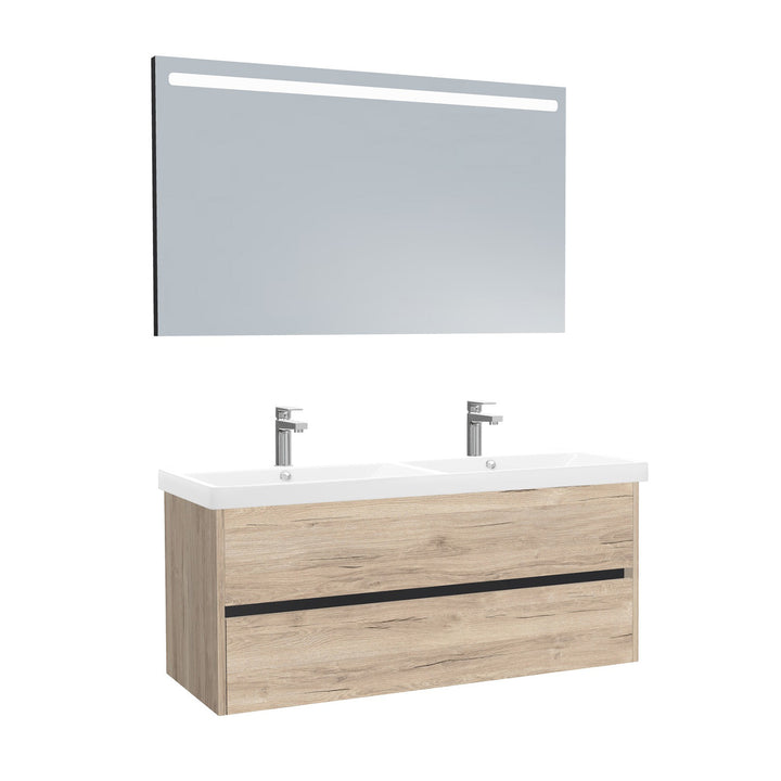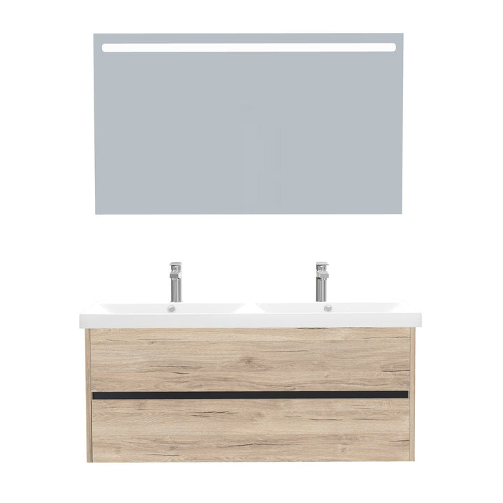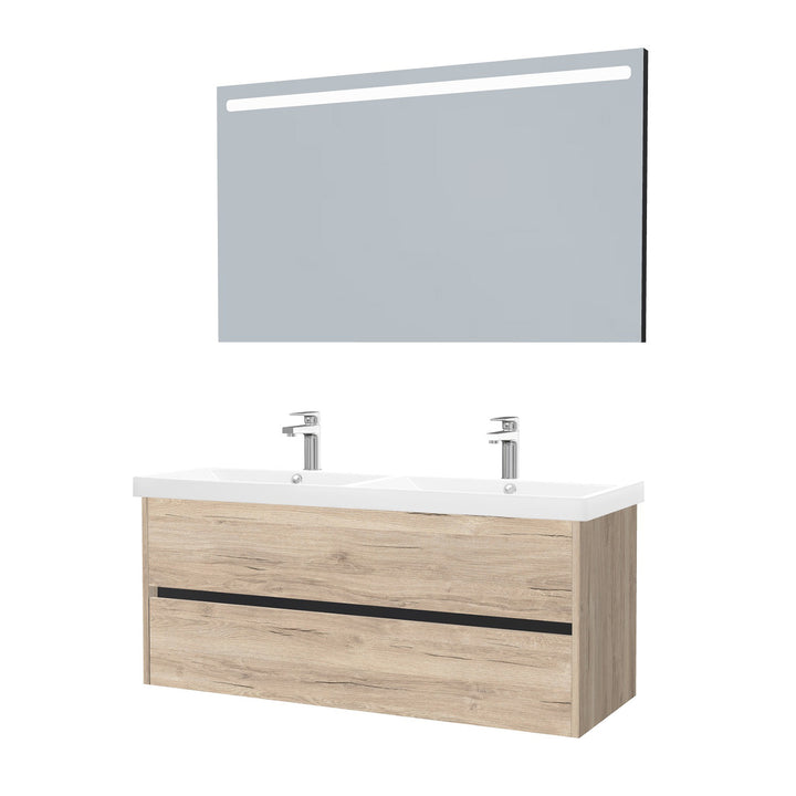 Jena Badkamermeubel Set 120 cm Duitse Eik - Onderkast MDF Softclose Greeploos 2 lades met Keramische Wastafel 2 kraangat en Badkamerspiegel met Led-verlichting