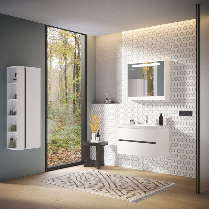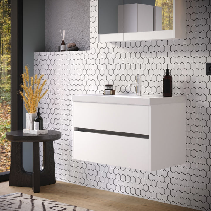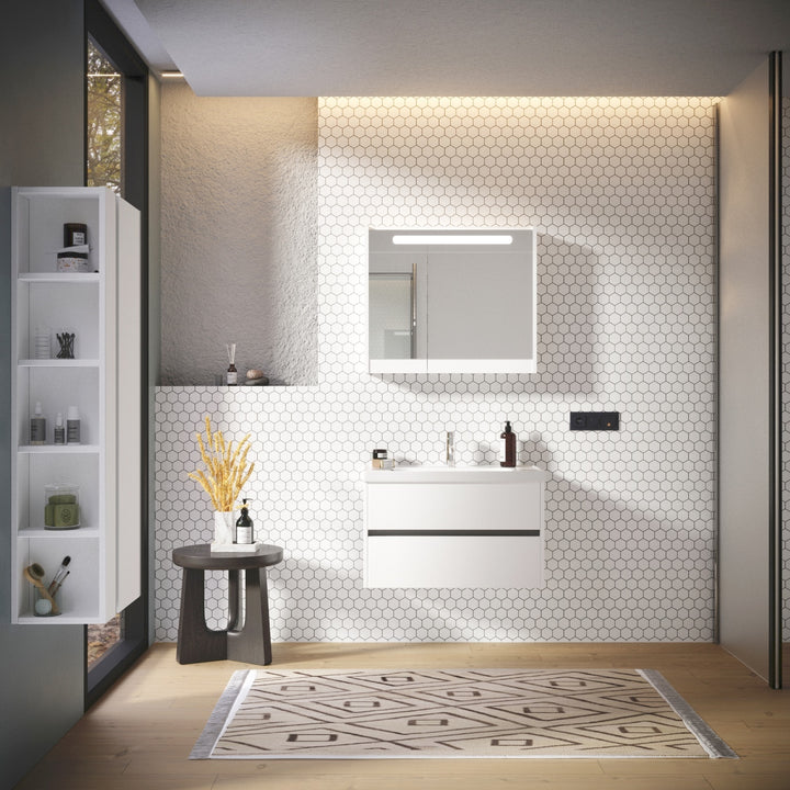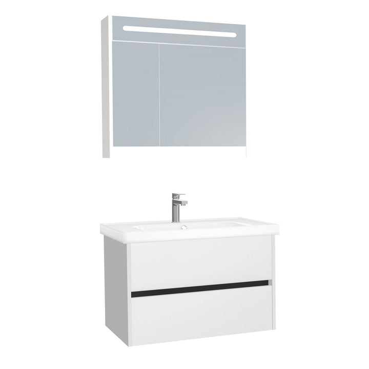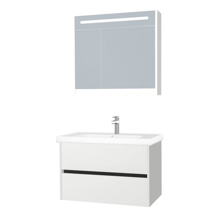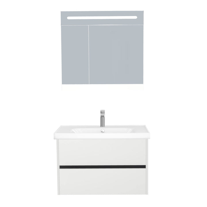 Jena Badkamermeubel Set 80 cm Hoogglans Wit - Onderkast MDF Softclose Greeploos 2 lades met Keramische Wastafel 1 kraangat en Badkamerspiegelkast met Led-verlichting