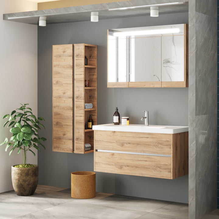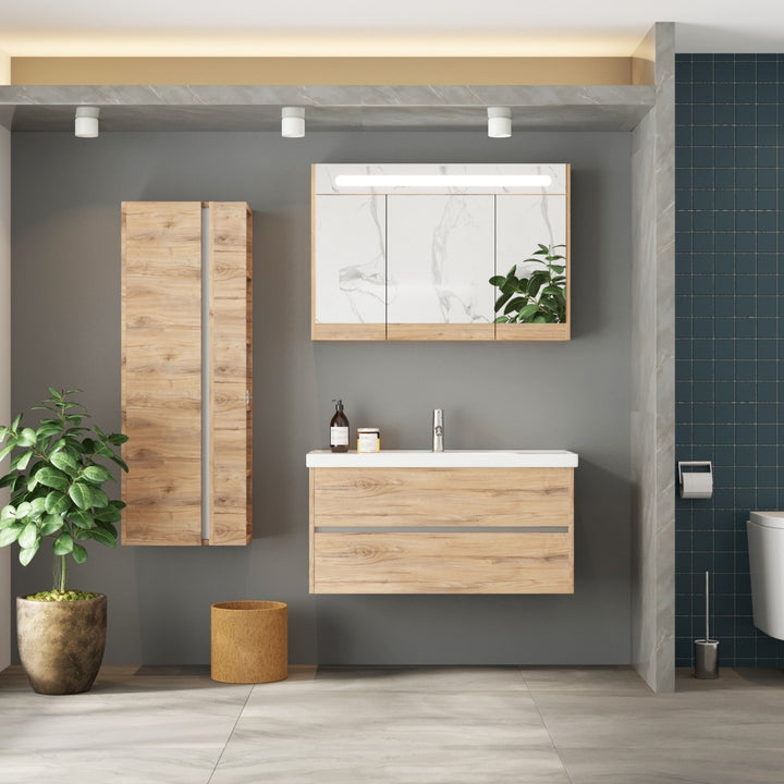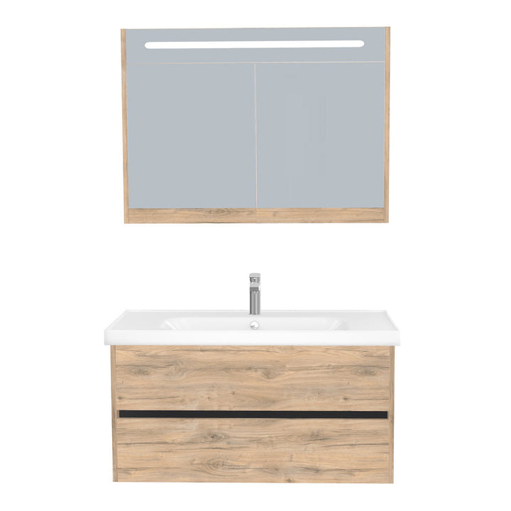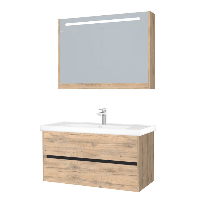 Jena Badkamermeubel Set 100 cm Dorado - Onderkast MDF Softclose Greeploos 2 lades met Keramische Wastafel 1 kraangat en Badkamerspiegelkast met Led-verlichting