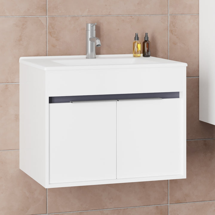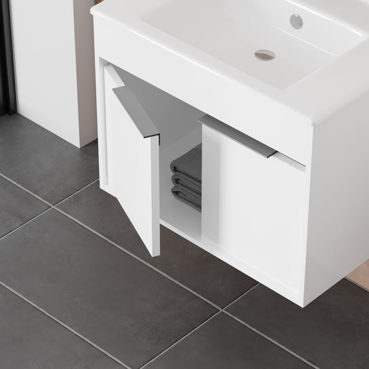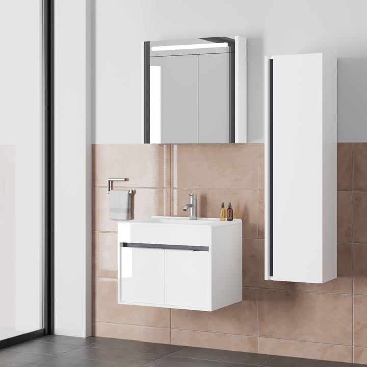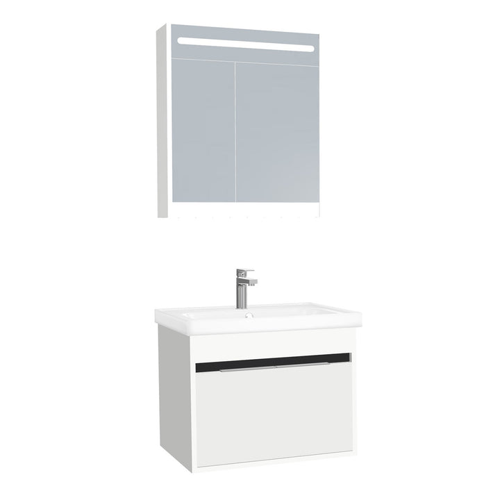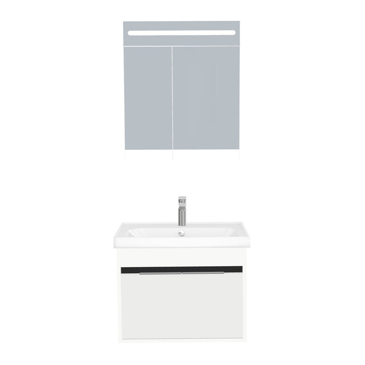 Kassel Badkamermeubel Set 65 cm Hoogglans Wit - Onderkast MDF Softclose Semi handgreep 2 deuren met Keramische Wastafel 1 kraangat en Badkamerspiegelkast met Led-verlichting
