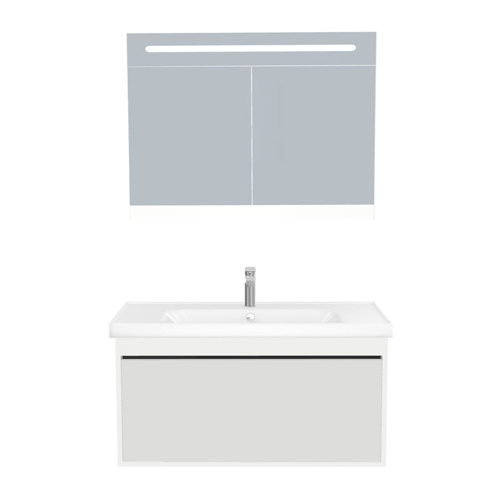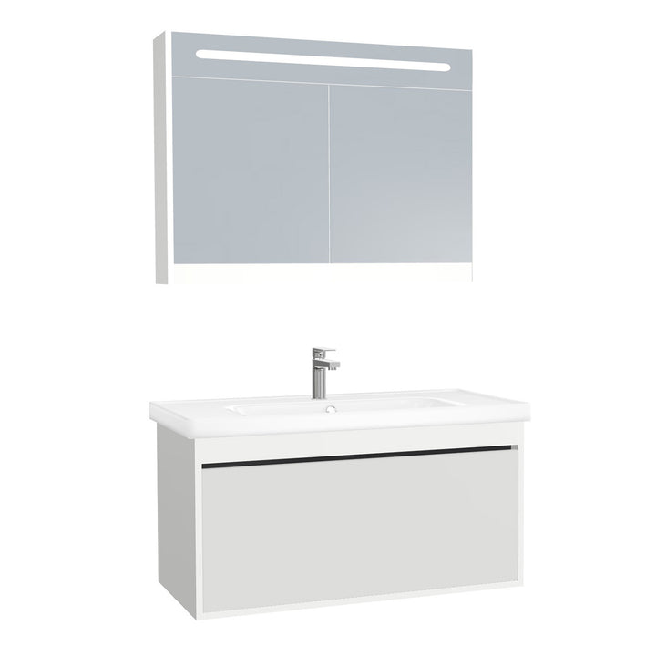 Oberhausen Badkamermeubel Set 100 cm Hoogglans Wit - Onderkast MDF Softclose Semi handgreep 1 lade met Keramische Wastafel 1 kraangat en Badkamerspiegelkast met Led-verlichting