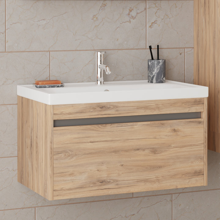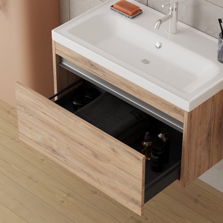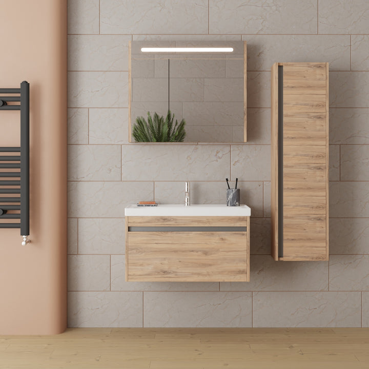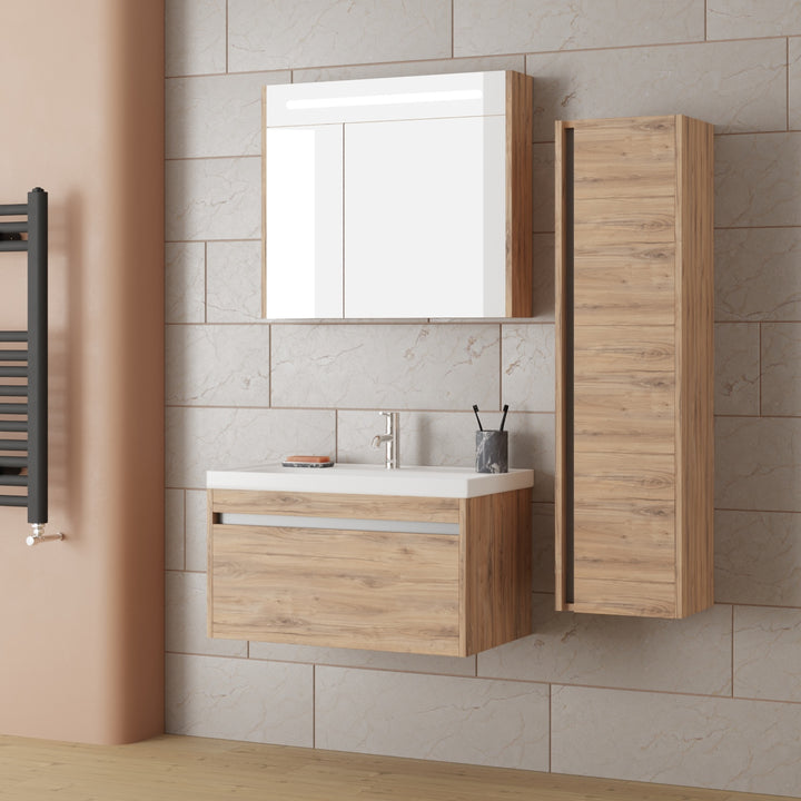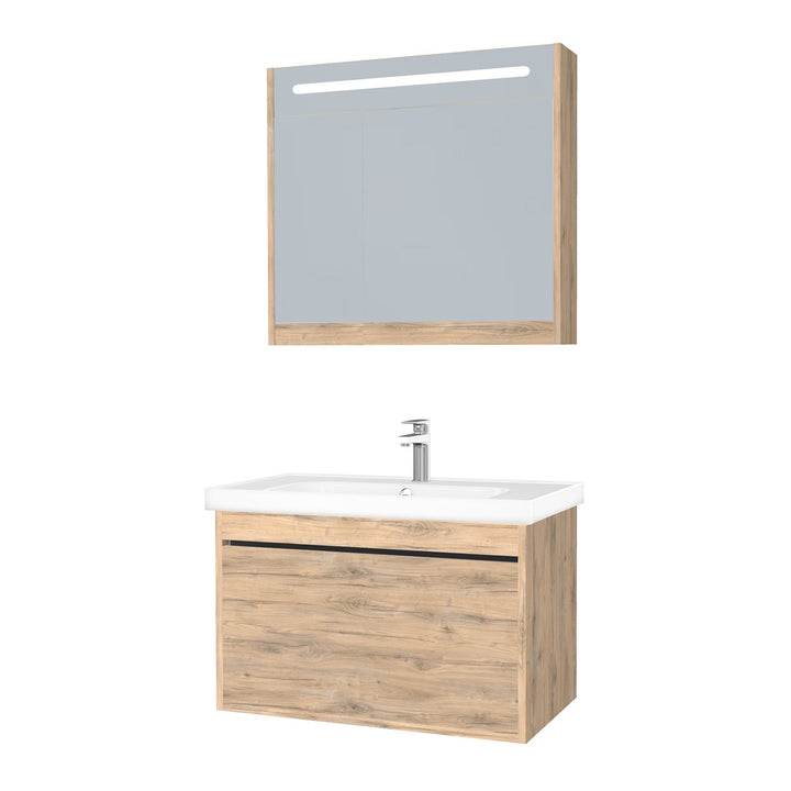 Oberhausen Badkamermeubel Set 80 cm Dorado - Onderkast MDF Softclose Semi handgreep 1 lade met Keramische Wastafel 1 kraangat en Badkamerspiegelkast met Led-verlichting
