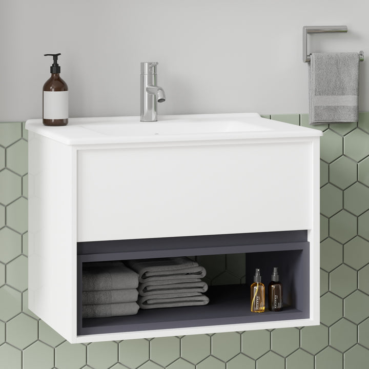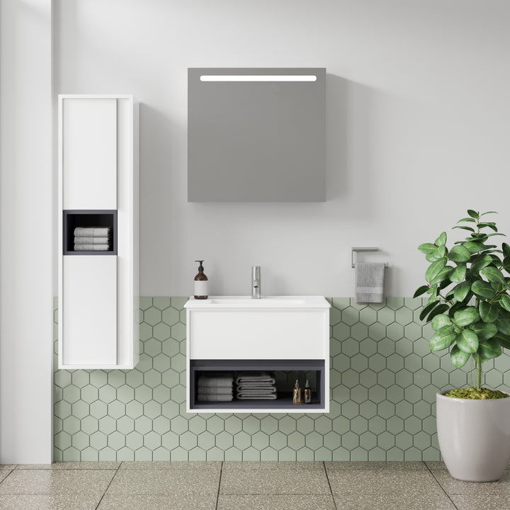 Pohlheim Badkamermeubel Set 65 cm Hoogglans Wit - Onderkast MDF Softclose Greeploos 1 lade met Keramische Wastafel 1 kraangat en Badkamerspiegel met Led-verlichting
